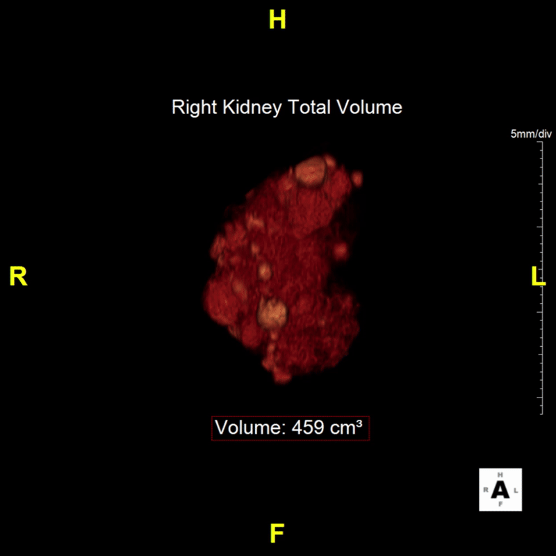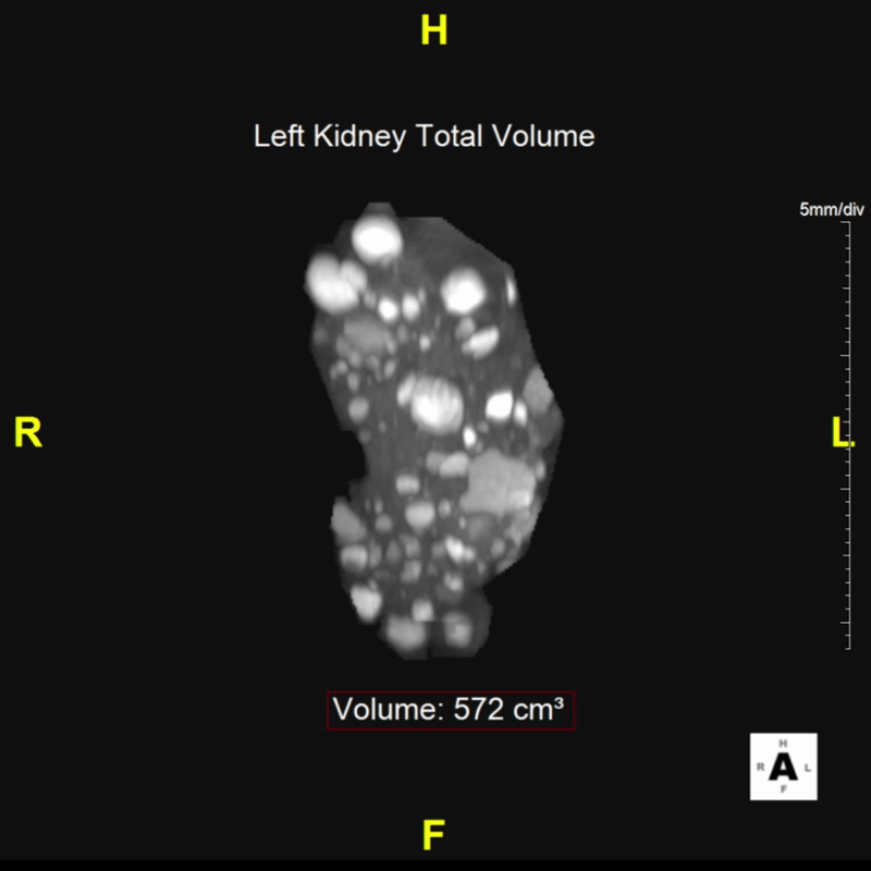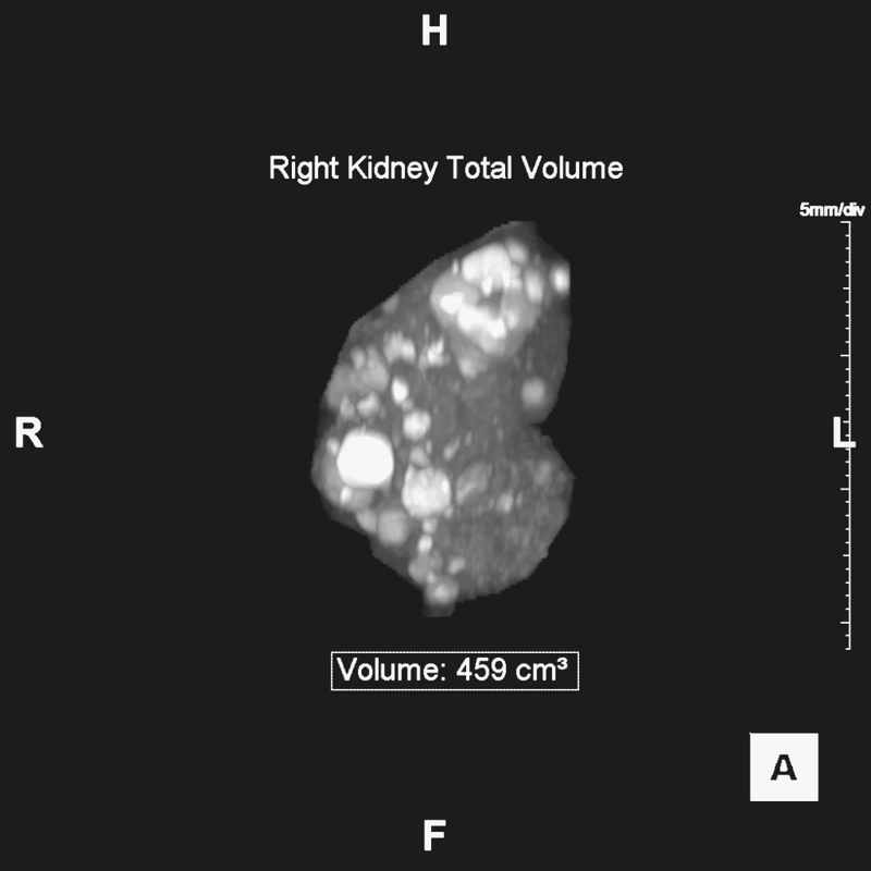 Figure A: A volume-rendered image of both kidneys, highlighting the extent of cyst infiltration.