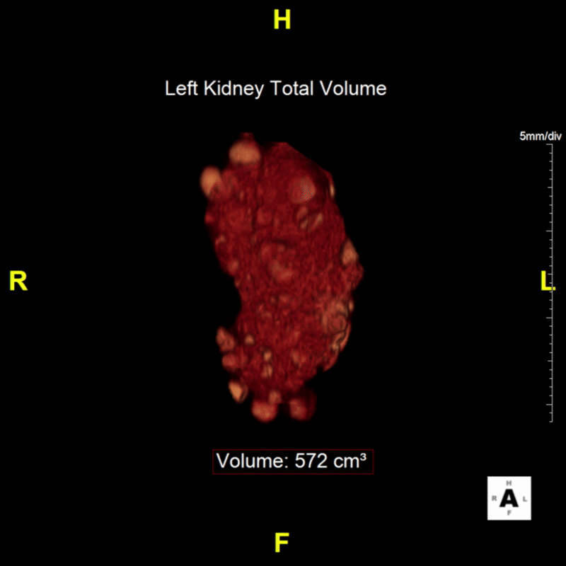 The kidney volumes obtained from the MRI (see below) were provided to the patient’s care team. These measurements were critical for determining the current state of the disease and guiding the management plan. With accurate knowledge of kidney volumes, providers can ensure that interventions are timely and targeted, helping to effectively slow the progression of the disease and manage symptoms more efficiently.