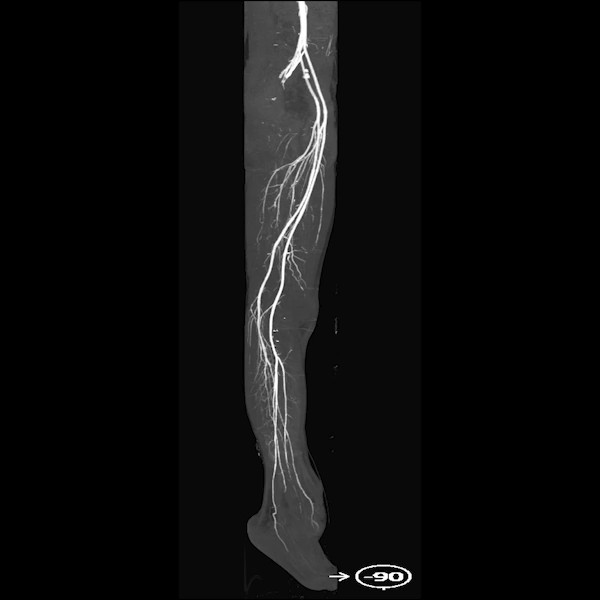 Figure C: The MIP clearly shows the lower extremity arteries on both sides, with no significant stenosis or obstructions, offering a clear view of blood flow from the pelvis to the legs.
