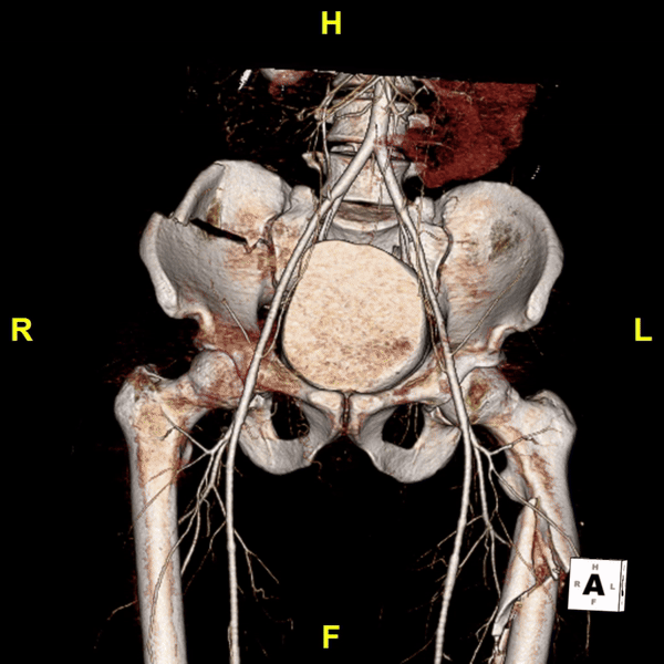 The imaging process began with a CT angiogram of the abdomen and pelvis, providing a view of both the bone and vascular anatomy. Using 3D post-processing techniques, the 3DQ Lab generated rotational views of the pelvis, left femur, tibia, and fibula, clearly illustrating the complex fracture patterns (as shown below).