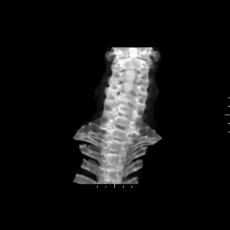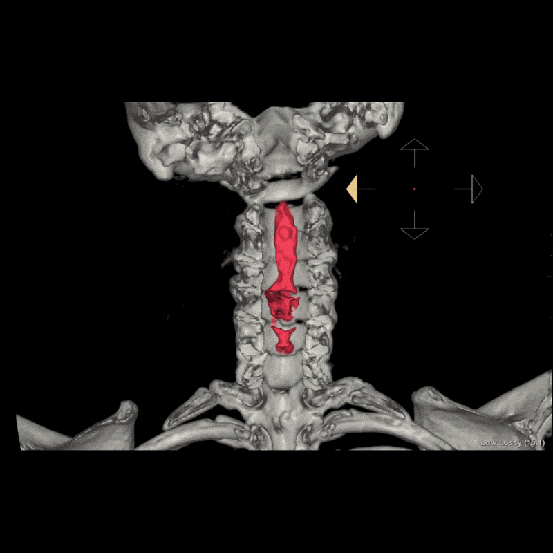 Using the CT dataset, a radiologic technologist processed the images to create a series of advanced visualizations that highlight the distribution of ossification and its relationship to surrounding anatomy. These images provide different perspectives of the cervical spine and help translate cross-sectional findings into more intuitive views.