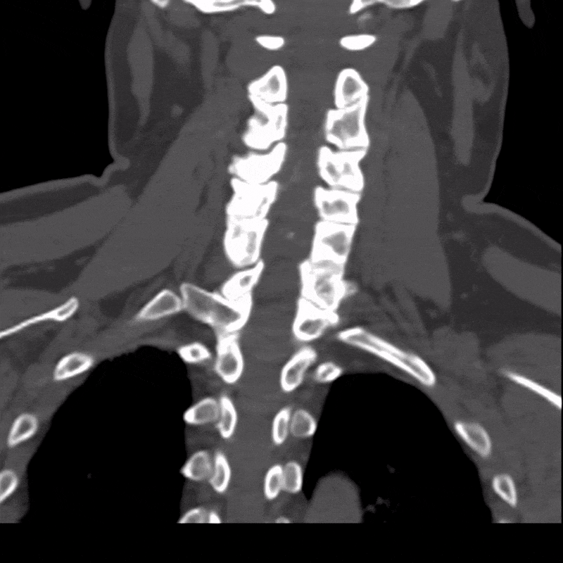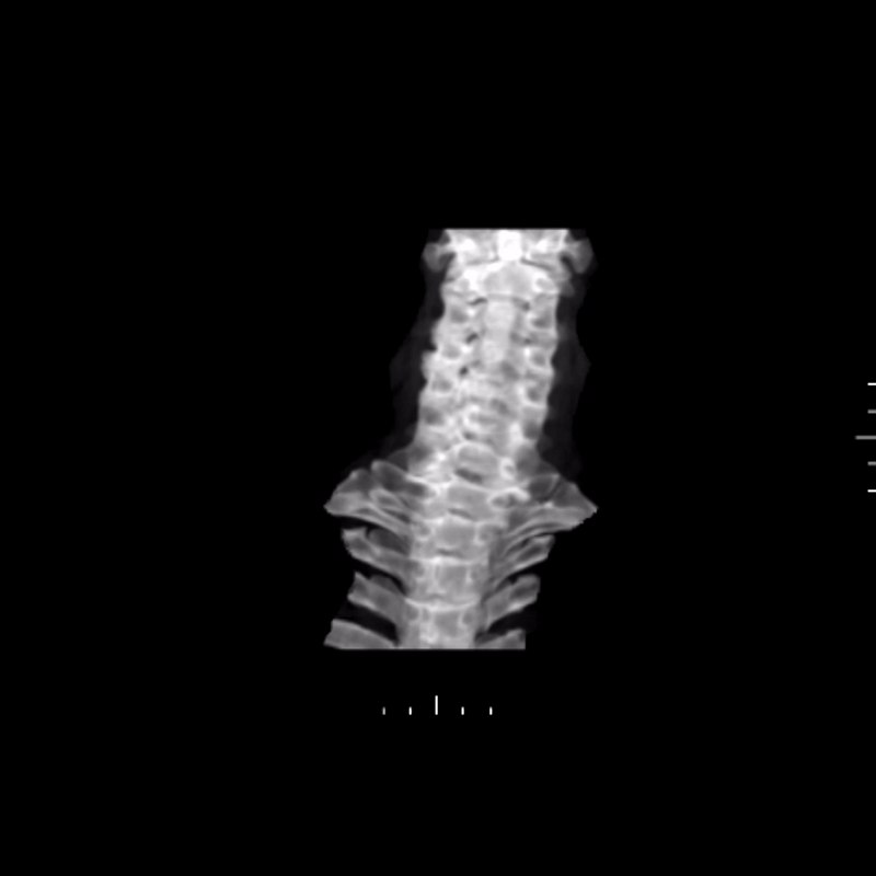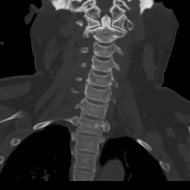 A CT scan of the cervical spine was obtained to further evaluate the presence and severity of OPLL. CT is well suited for this assessment because it clearly depicts bone and calcified structures, allowing the ossified ligament to be easily distinguished from surrounding soft tissues. The scan confirmed extensive OPLL from C2 through C6 with severe spinal canal stenosis.