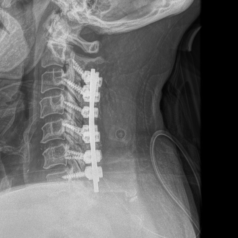 Given the severity of spinal canal stenosis and associated spinal cord compression, surgical intervention was pursued. Treatment for OPLL in cases such as this typically focuses on decompressing the spinal cord and stabilizing the cervical spine to prevent further neurologic decline. In this case, a postoperative X-ray demonstrates the implanted hardware used to provide spinal stability following decompression.
