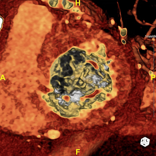Figure A: 3D rendering of the patient’s heart. The blood–flow is shown in magenta and the mitral calcification in yellow.